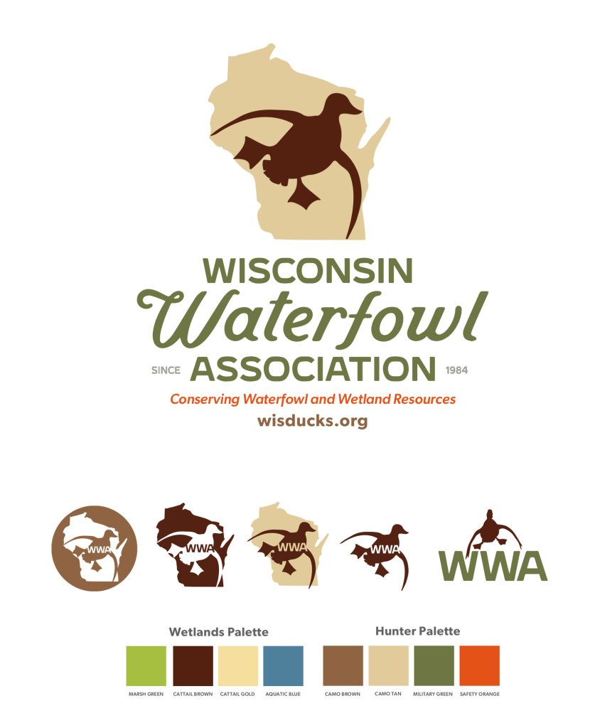 This is a concept for a redesigned logo for Wisconsin Waterfowl Association; WWA is a membership-based organization founded in 1984 by and for Wisconsin hunters. The current logo (below) feels outdated, disjointed and the duck — the most important part of their identity — is hard to see, especially when the logo is reduced.